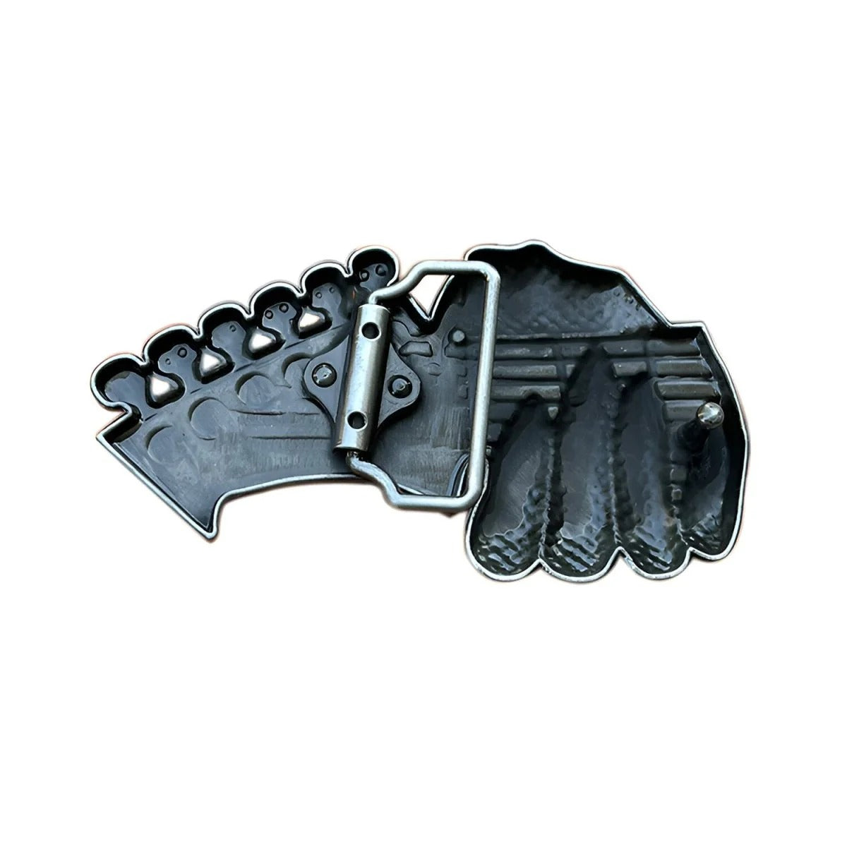 À tous les amateurs et les fans de rock'n'roll, cette boucle de ceinture arbore une tête de guitare ainsi qu'une main ornée d'écailles en train d'effectuer un solo.