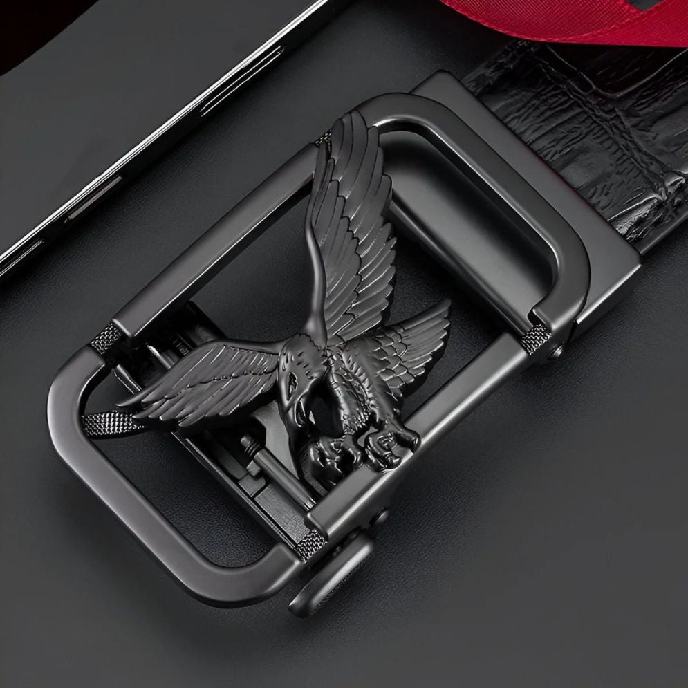 Le mélange entre métal noir mat et cuir pleine fleur de couleur noir crée un contraste à relief haute définition qui offre également un effet dynamique à vos tenues grâce à l'envol de l'aigle semblant intemporel. En un simple clic, votre élégance est verrouillée autour de vos hanches et l'aigle sculpté veille sur votre allure.